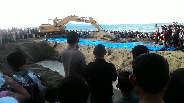 Empat bangkai paus jenis sperma yang terdampar di Aceh mulai dikuburkan. Lokasi kuburannya hanya berjarak selemparan watu dari posisi bangkai terletak. Proses penguburannya pun harus menggunakan dua unit alat berat jenis beckhoe.