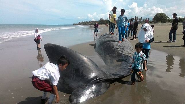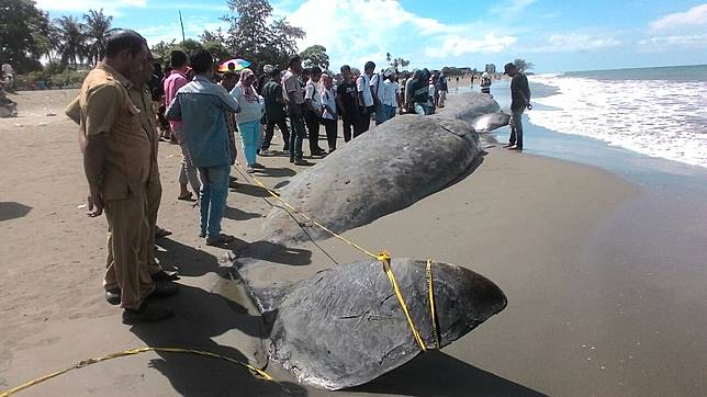 BANDA ACEH, Indonesia — Warga Aceh dihebohkan dengan penemuan 10 ekor paus sperma yang terdampar di Pantai Ujong Kareung, Desa Durung Kecamatan Mesjid Raya, Aceh Besar Aceh, Senin 13 November 2017. Paus-paus tersebut pertama sekali diketahui nelayan pada pukul 10:00 WIB.