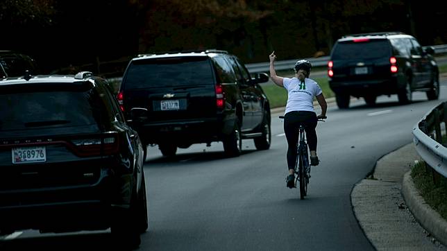Briskman mengacungkan jari tengah untuk rombongan Trump yang melintas dikala beliau sedang bersepeda. Adegan di Virginia pada 28 Oktober lalu ini tertangkap kamera, eksklusif jadi viral.